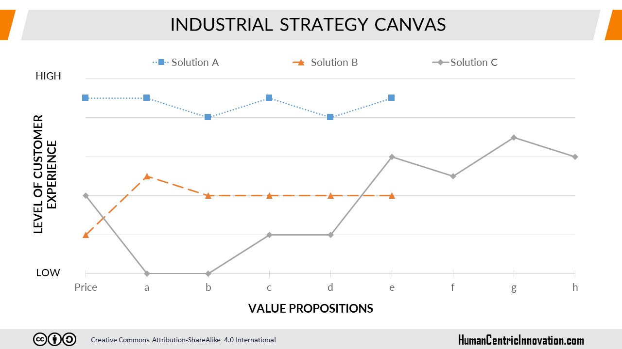 Looking at industries from a critically discerning perspective is a great way to capture unmet needs of all the audiences targeted by them. While explaining the Blue Ocean Strategy, Chan Kim and Renee Mauborgne suggest a useful tool to do this. This tool clearly shows three of the main elements of the dominant strategic configuration in an industry. The first is the factors the industry competes with, namely its primary value propositions. The second is what customers experience or can obtain on the basis of these factors. The third is the strategic profiles of all solutions in the industry.
