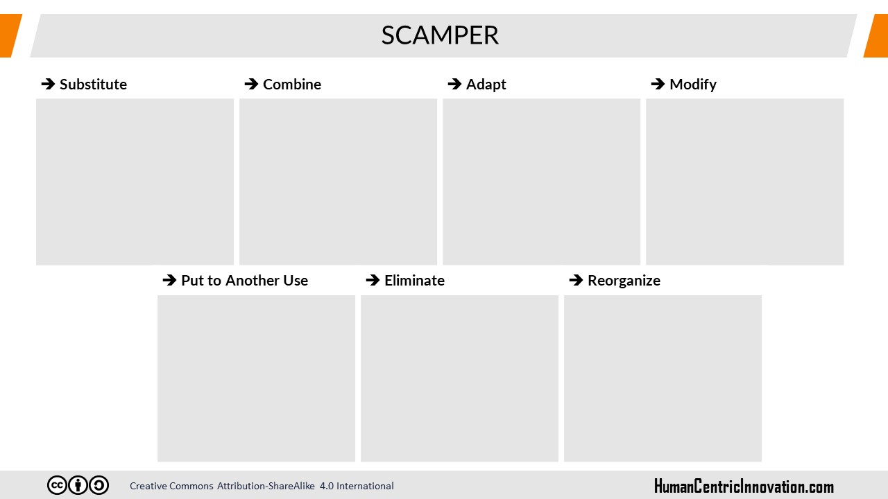 This is a lateral thinking technique developed by Bob Eberle to generate innovative solution ideas by changing a product or service. The name is an acronym that stands for the first letters of the seven different approaches to use within the technique.